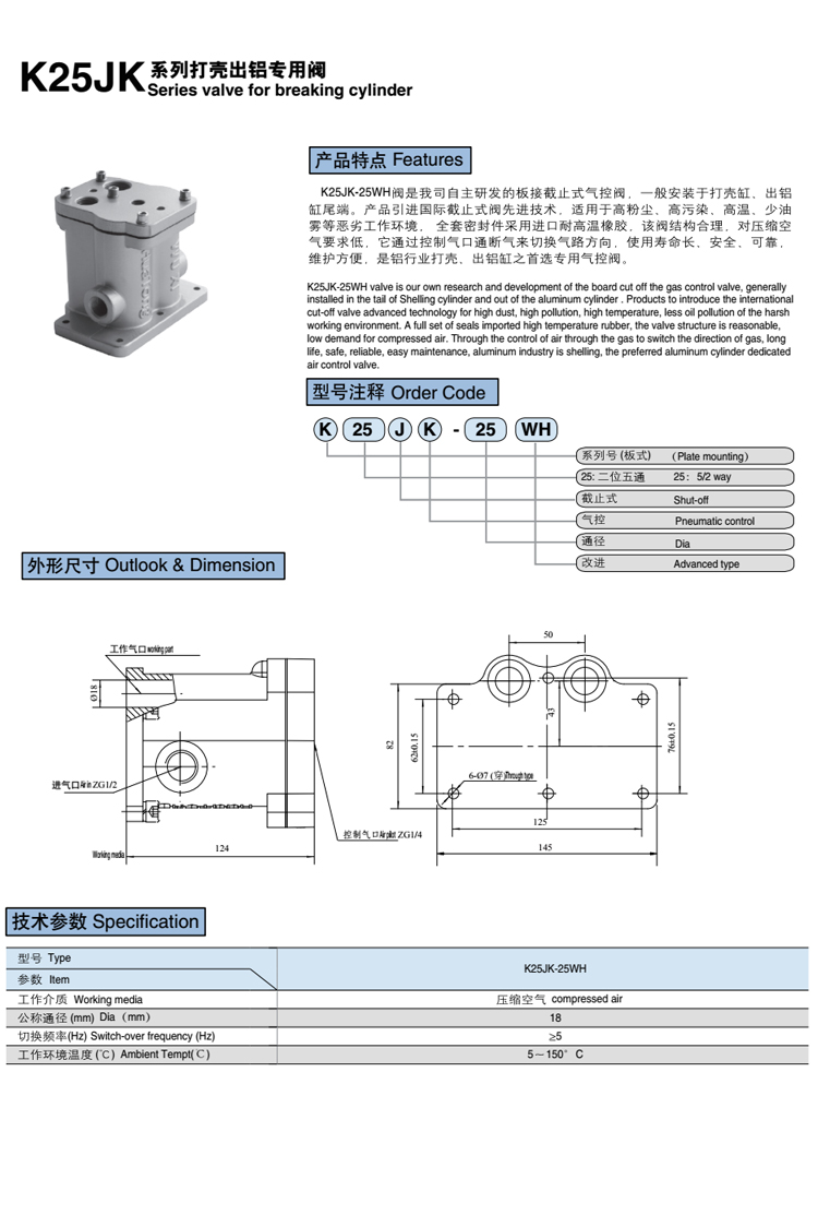 K25JK 系列打殼出鋁專用閥產(chǎn)品特點: K25JK-25WH閥是我司自主研發(fā)的板接截止式氣控閥,一般安裝于打殼缸、出鋁缸尾端。產(chǎn)品引進(jìn)國際截止式閥先進(jìn)技術(shù),適用于高粉塵、高污染、高溫、少油霧等惡劣工作環(huán)境, 全套密封件采用進(jìn)口耐高溫橡膠,該閥結(jié)